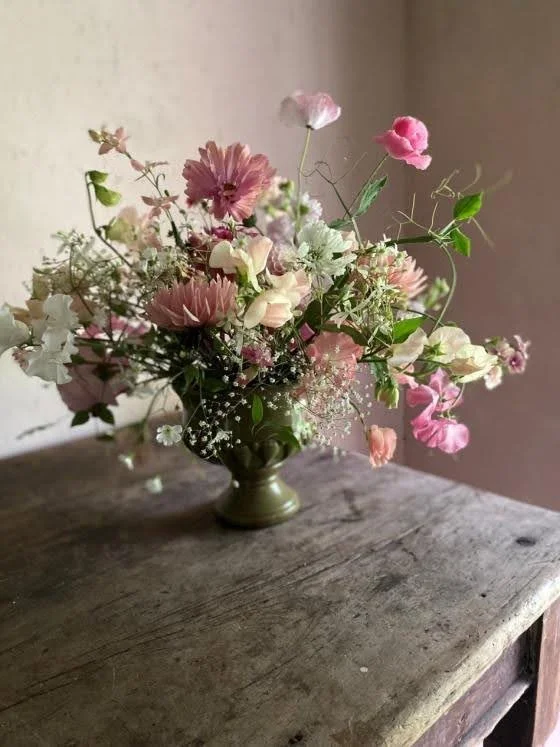 The evening class is £45pp, 6.30pm - 9pm.Delicate poppies, corn flowers, sweet peas, and June roses paired with orlaya and other frothy meadow flowers. Jan will demonstrate a meadow table-scape and how to make a spiralled hand tied bouquet.